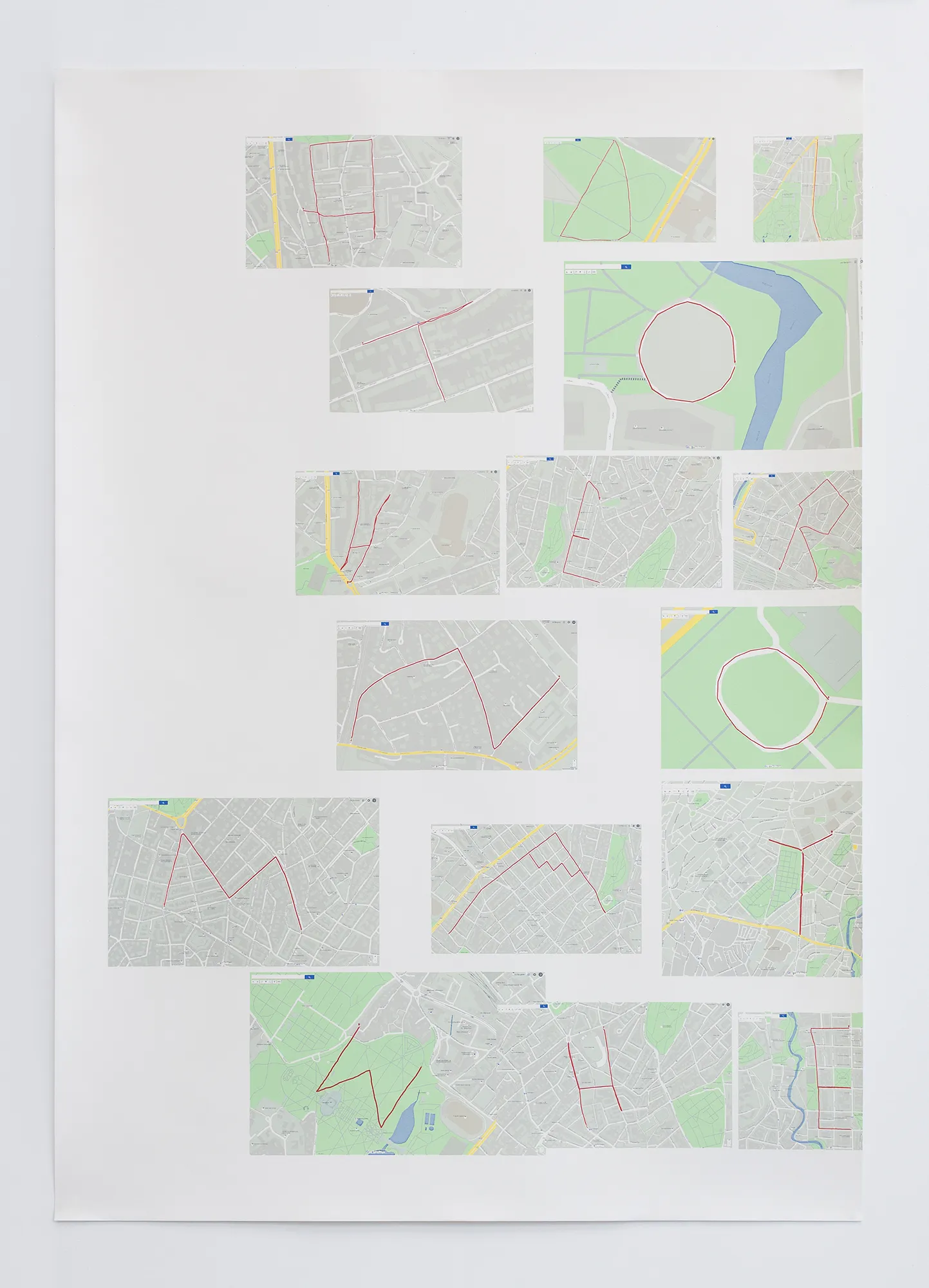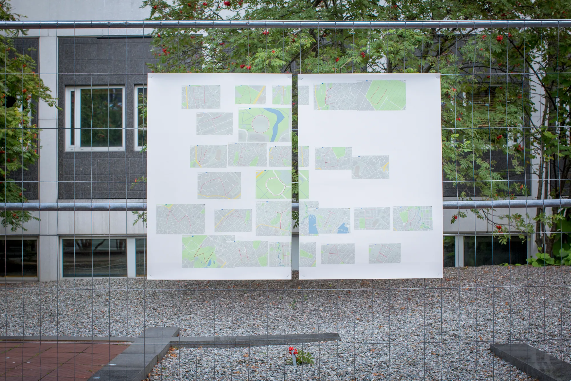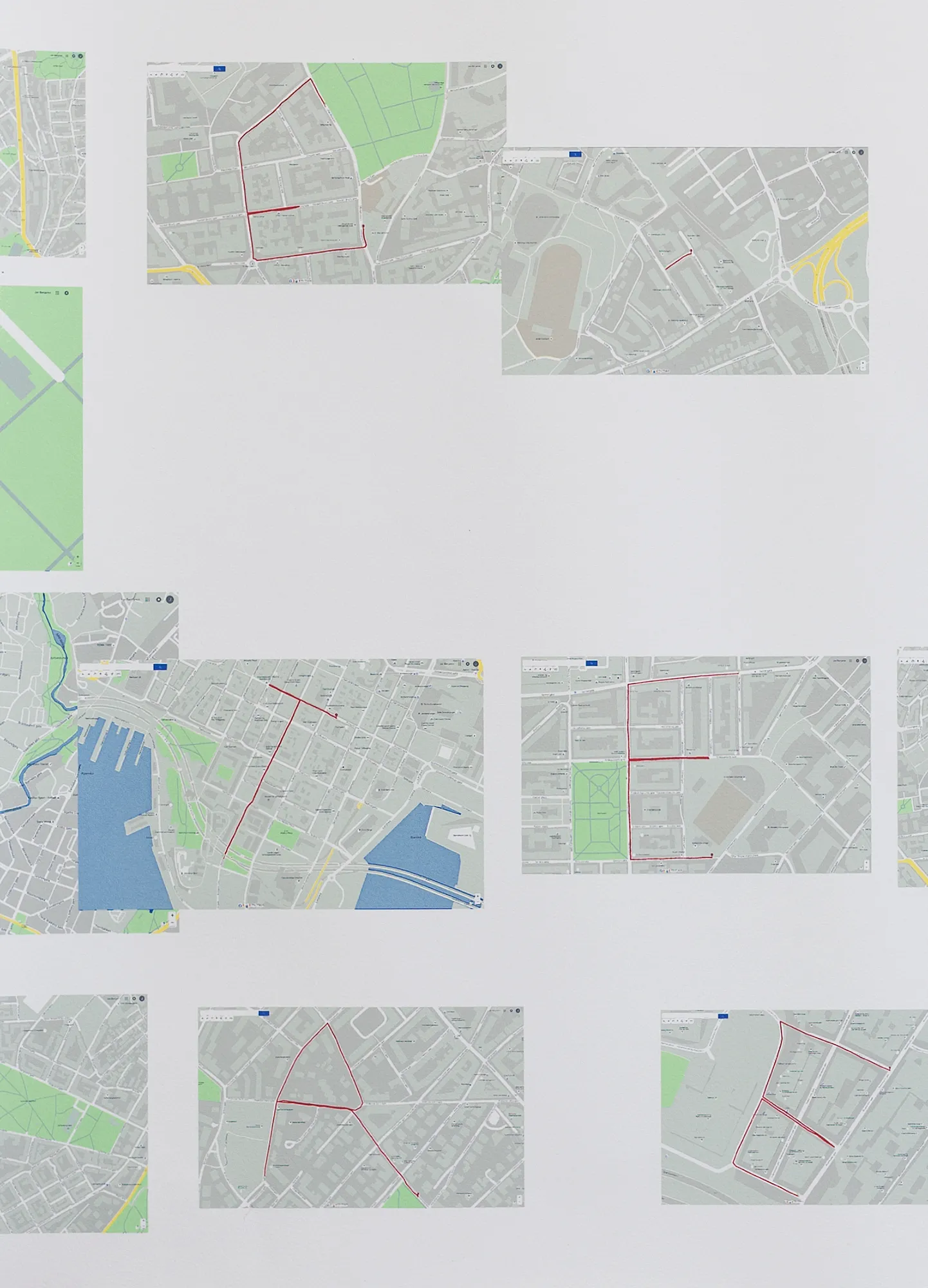 Tallerås walked the letters of the quote from French poet Arthur Rimbaud where the street map allowed the letters to be drawn. Via the Runkeeper app, his walks were recorded and could be transcribed onto a Google map. The 28 kilometres that make up the letters in Adieu to Here No Matter Where do not begin to encompass the many kilometres the artist has walked between the different streets.